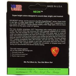 Todas as cordas incluem o revestimento K3 de cor neon, proporcionando longevidade, mais projeção, menos tons indesejados, além de clareza e articulação aprimoradas - 11, 14, 18, 28, 38, 50