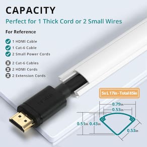 5 peças de corretivo branco com cordão de canto: L 17 polegadas, comprimento total 85 polegadas. Extremamente perfeito para esconder cabos para TV de canto montada na parede e na parte inferior da parede, capaz de esconder 1 cabo grosso (como 1 cabo HDMI) ou 2 cabos pequenos (como 2 cabos USB). Nota: A fita não pode ser em paredes texturizadas.