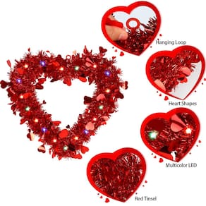 Grinalda de coração de relit de dia dos namorados decoração de folha vermelha tinsel coroa em forma de coração com cordão de luzes penduradas decoração de tinsel para decoração de porta da frente interior e exterior - Pacote: Você receberá 3 unidades pré-iluminadas para o Dia dos Namorados em formato de coração vermelho com LED multicolorido de 20 quilates. Cada guirlanda de coração dos namorados tem cerca de 30 x 30 cm de tamanho; grande e brilhante o suficiente para atender às suas necessidades e chamar a atenção das pessoas, perfeita para decoração de dia dos namorados em ambientes internos e externos. - Alta qualidade: a guirlanda pré-iluminada dos namorados é feita de enfeites metálicos, com moldura interna de plástico premium e é moldada em forma de coração por fio de metal, durável e resistente, fácil de pendurar e reutilizável por um longo tempo. - Guirlanda de LED em forma de coração: a guirlanda vermelha é projetada em forma de coração, com lantejoulas de folha de coração de amor. E a cor vermelha é muito atraente. Delicada e romântica, cheia de características do Dia dos Namorados. Além disso, cada guirlanda é combinada com luzes coloridas para torná-la atraente o tempo todo. Alimentado pela caixa de baterias (3 pilhas AA não incluídas). E essas luzes têm duas funções: cintilante/flash ou estável. - Fácil de pendurar: cada guirlanda de enfeites pré-iluminada em forma de coração tem um laço para pendurar na parte superior para que você possa pendurá-la onde quiser convenientemente. Você pode pendurá-la na parede, janela, porta e mais lugares onde você gosta de decorar seu quarto. - Ampla aplicação: estas decorações de guirlanda em forma de coração vermelho são perfeitas para o Dia dos Namorados, casamentos, noivados, aniversários, festas de aniversário, propostas e muito mais. Você pode janelas, tetos, paredes, cornija, mesas, etc. Traga uma atmosfera romântica para sua casa e festa.
