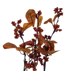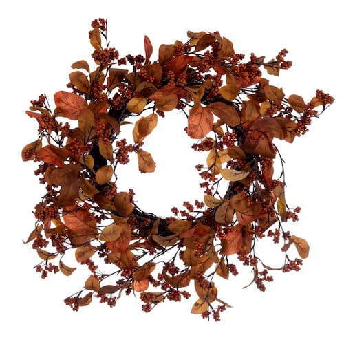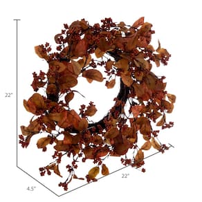Coroa artificial de folhas de outono e frutos silvestres de 22 polegadas da Vickerman. Apresenta pequenos detalhes em laranja e uma base circular de videira.