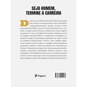 SEJA HOMEM, TERMINE A CARREIRA Dentre tantas deficiências altamente proclamadas dos homens contemporâneos está a disciplina. Surpreendentemente, muitos recursos sobre masculinidade bíblica parecem mais interessados em controlar a relação entre homens e mulheres ou mesmo regular a aparência, a voz e os hobbies dos homens cristãos ao invés do simples chamado bíblico à moderação, à disciplina e à piedade. Longe de estereótipos populares em redes sociais ou panfletos politicamente corretos, Tim Challies elabora de maneira direta, prática e completa quais disciplinas espirituais, práticas e relacionais devem ser cultivadas por homens. Passando por tópicos tão diversos quanto envelhecimento, casamento, sexualidade, dinheiro, oração e vida eclesiástica, Tim Challies mostra como a corrida do homem cristão é muito mais longa (e recompensadora) do que qualquer modismo cultural ou sugestão mundana fazem parecer.
