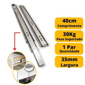 a corrediça telescópica é indicada para gavetas de cozinhas, closets, quartos, banheiros, lavanderias, prateleiras retráteis/extensíveis, bases de teclado e mobiliário em geral. Corrediça telescópica light, uma excelente opção de custo-benefício para seus projetos, mantendo o bom funcionamento das gavetas projetadas por você. Trava de segurança evitando queda na abertura da gaveta. Rolamento via de aço que proporciona deslizamento suave, preciso e resistente. Produzido em aço laminado a frio com tratamento de eletro-zinco. - marca: metalnox contém: 1 par 2 und - comprimento: 40cm / 400mm - largura: 35mm - para uso geral - possibilita a abertura total da gaveta com deslizamento suave, preciso e resistente - corpo em aço galvanizado - deslizamento através de de aço - tipo: telescópica - o par suporta até 30kgs