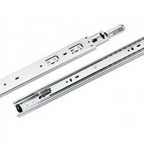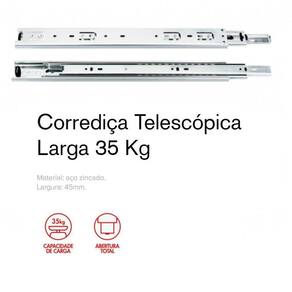 Corrediças telescópicas para gaveta de móveis e armários As corrediças telescópicas permitem abertura suave e total de gavetas, pastas suspensas e sistemas telescópicos, possui abertura total, Cada trilho é uma peça única que é fixada tanto na gaveta quanto na parede de apoio. Design moderno e discreto podendo ser usados em quartos, cozinha, banheiros, escritórios, salas de estar e jantar e áreas de serviço. Características e qualidades: produzido em aço zincado abertura suave, silenciosa e total das gavetas trava de final de curso fácil instalação grande resistência e durabilidade Ficha técnica: medidas: 35 x 4,5 x 1 cm (comprimento, altura e largura) capacidade máxima de peso: 35kg instalação com parafusos 3,5x14mm (não inclusos) Itens inclusos na embalagem: 1 Par(es) de trilhos telescópicos 35cm