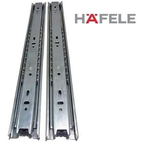 Marca: hafele Modelo: corrediça telescópica zincada 500mm Referência:422.87.951 Extração total Tamanho: 500mm Capacidade de carga: até 30kg Material: aço Versão: desengatável através da alavanca de separação, com proteção de retenção na posição fechada Montagem: para aparafusar nas laterias Certificada: 60.000 ciclos Ean: 4015643811056