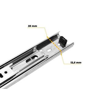 Modelo: H35 light Acabamento: Zincado Marca: HD Tipo de corrediça: Telescópica Comercializado: Par Abertura: Extração total Material: Aço relaminado Folgas e espaços: 12,5 mm (espessura da corrediça) Uso recomendado: Gavetas de móveis em geral
