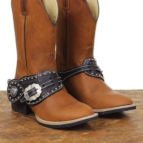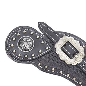 A Correia de Espora Larga com Margarida da Top Equine combina elegância e durabilidade. Feita de couro marrom de alta qualidade, possui uma fivela de metal em formato de flor, detalhes em relevo e tachas prateadas nas bordas. Este acessório é ideal para equitação, oferecendo um toque de sofisticação e originalidade.