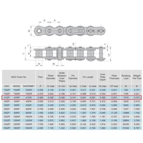 #41NP Corrente niquelada de 50 pés com 5 elos de conexão Tamanho do passo resistente à corrosão: 0,500 polegadas Diâmetro do rolo: 0,306 polegadas Largura entre as placas internas: 0,246 polegadas Diâmetro do pino: 0,141 polegadas Comprimento do pino L Máximo: 0,541 polegadas Comprimento do pino Lc Max: 0,591 polegadas Profundidade da placa interna: 0,390 polegadas Espessura da placa: 0,051 polegadas Resistência média à tração: 1516 libras Material: aço carbono com níquel Comprimento do revestimento revestido: 50 pés Peso por pé: 0,275 libras Todos os nossos produtos de cadeia passaram por rigorosas medidas de processo para obter a melhor qualidade! Isso inclui tratamento térmico, que garante a vida útil e a tenacidade ideais para todos os componentes. Os rolos de precisão sólidos endurecidos e perfurados por granalha são padrão na maioria de nossas correntes. As buchas fornecem um efeito de rolamento suave, reduzindo a carga de impacto à medida que a corrente engata o dente da roda dentada. Durante a montagem da corrente, todos os componentes da corrente são orientados para garantir que os pinos, buchas e placas laterais estejam posicionados corretamente para uma ótima resistência da corrente e longa vida útil. As correntes montadas são então mergulhadas em um lubrificante quente. Essa lubrificação e o processo no qual ela é aplicada melhoram muito a capacidade de vida útil da corrente e a protegem ainda mais dos efeitos do meio ambiente. Todas as nossas correntes são pré-carregadas de fábrica. Eles são pré-testados para suportar e manter a carga esperada que a corrente verá quando estiver em uso. Isso ajuda a alinhar as partes da corrente, o que minimizará o alongamento inicial. Isso aumentará drasticamente a vida útil da corrente. Toda a nossa cadeia é certificada pela certificação ISO 9001:2000 QM por meio da ISO 14001 (que documenta a sustentabilidade e a compatibilidade ambiental dos processos de produção e descarte de resíduos) até os requisitos de qualidade ISO/TS 16949 para a indústria automotiva. - Corrente de rolos industrial niquelada ASNI #41NP - Tamanho do passo: 0,500 polegadas - Comprimento: 50 pés - Resistência média à tração: 1516 libras - Peso por pé: 0,275 libras
