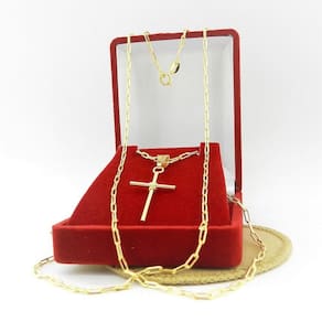 Corrente Masculina 70cm 2mm + Cruz 30mm Folheado Ouro CR543-marca: Wnbijouterias-pingente: Cruz Palito 15x30mm 2Gr-modelo: 1x1 Cadeado-comprimento: 50cm 5Gr-largura: 2mm-modelo Fecho: Boia-peso: 5+3Gr-SKU Vendedor: CR543Descrição Técnica:- Produto com banho super resistente.- Processo de Folheação em 3 Camadas de Ouro 18k= 750 - Não descasca, não perde a cor, qualidade garantida- Grande tempo de durabilidade.- Acompanha Saquinho porta Jóia.- Todas as Fotos são Reais do ProdutoAcompanha: Certificado de garantiaOBS: Garantia apenas para descascamento do banho da jóia. A garantia não cobre defeitos de mau uso, aranhões ou quebra de partes da jóia.Contra Indicações:- Não usar creme, perfume, protetor solar e outros cosméticos por cima da jóia.- Evitar banho de mar Devido a oxidação da água Salgada - Evitar banho de piscina Devido a oxidação do Cloro e outros produtos