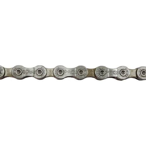 Corrente fina 9 velocidades 1/2x11/128 116 elos index Embalagem em polybag Para uso em: bicicletas que utilizam roda livre de 9 velocidades ou pinhão k-9 Medida: ½ x 11/128 polegadas 116 elos Marca: paco Composição: aço