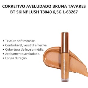 Corretivo Aveludado Bruna Tavares Bt Skinplush T3040 6,5G L-63267 Corretivo Aveludado Bt SkinPlush T3040 Um corretivo de textura soft mousse que oferece uma cobertura de leve a média e acabamento aveludado. Além de corrigir, iluminar e camuflar, o BT Skinplush conta com diversos ativos que ajudam a atenuar a aparência das olheiras e bolsas ao redor dos olhos. Ele também auxilia na hidratação e melhora da elasticidade da pele. Possui uma textura mousse, versátil e aveludada que garante maior conforto ao longo do uso. Ele é resistente à água, suor e oleosidade.Subtom quente levemente alaranjado. . Benefícios -textura soft mousse. -confortável, versátil e flexível. -cobertura de leve a média. -acabamento aveludado. -longa duração. -oftalmologicamente testado. -dermatologicamente testado. -não testado em animais. . Modo de Uso Com o auxílio do aplicador, deposite o corretivo nas áreas que deseja disfarçar e corrigir.Em seguida, dê leves batidinhas com a esponja, a ponta dos dedos ou com um pincel, até o produto aderir na pele de maneira natural e sem marcas. Ean: 7896032679269
