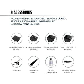 Conta com incríveis 9 acessórios e 4 opções de pentes para corte que se ajustam em até 4 alturas de corte, sendo (3, 6, 9 e 12mm). Também acompanha tesoura, capa protetora de lâminas, óleo lubrificante e escova para limpeza, tudo para garantir o perfeito funcionamento.