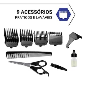 - Tesoura, pente, protetor de laminas, oleo para lubrificacao e escova para limpeza