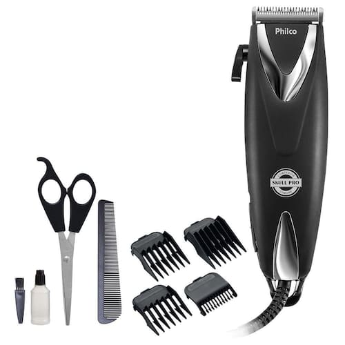 Cortador de Cabelos Philco PCR12CR Skull Pro Chrome é 9 Em 1. São 9 acessórios e 4 pentes com 5 alturas de corte - 0mm, 3mm, 6mm, 9mm e 12mm, sendo: protetor de lâminas, tesoura, pente, escova para limpeza e óleo de manutenção.