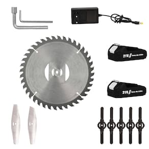 01 Cortador de grama a bateria TGRAM21 01 Lâmina circular 02 Lâminas de metal 05 Lâminas de plástico 01 Chave para parafuso do escudo protetor 01 Chave para porca autotravante 02 Baterias 21V 01 Carregador