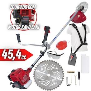 A roçadeira Nakashi L 450-K é equipada com motor Kawasaki de 45,4cc, 2 tempos, à gasolina, ideal para intensivo. Conta com manopla ergonômica, e duas opções de corte: lâmina de vídea e cabeçote de fio de nylon. Acompanha acessórios. ;