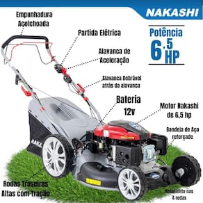 A grande vantagem do cortador de grama Nakashi LR225TE a gasolina, é que ;pode ser em terrenos grandes sem a limitação do cabeamento necessário para o uso da energia elétrica, ideal para quem busca cortar uma maior área de grama com rapidez e eficiência. Compacto e fácil de usar, possui ;descarga 4 em 1 com função coletora, recicladora, descarga lateral e traseira.