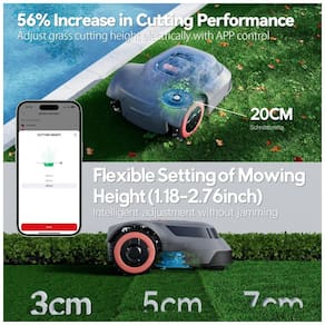 Equipado com tração em duas rodas, suporta inclinações de até 45% (24°) e modo rápido para áreas pequenas, integrando sensores de colisão para mudança de direção e evasão de obstáculos. Classificação IPX6 permite uso em chuva leve e limpeza com mangueira, com detecção automática de rupturas no fio perimetral de 120 metros, identificando localização via app para reparo simples com conector fornecido.