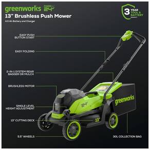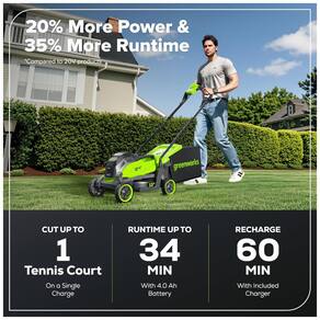 Especificações: Fonte de Energia: Alimentado por Bateria, Cor: Verde e Preto, Peso do Item: 12 kg, Largura de Corte: 33 cm, Número de Posições: 5, Modo de Operação: Manual, Dimensões do Produto: 103 cm x 37 cm x 96 cm, UPC: 195526201366, Altura de Corte Máxima Ajustável: 2 cm, Altura de Corte Mínima Ajustável: 7,62 cm, Fabricante: Greenworks, Número do Modelo: MO24L411-00, Baterias: Requer 1 bateria de Íon de Lítio (incluída) Voltagem:110 volts Marca: Não Informado