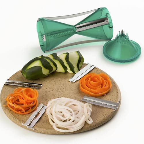 O SpiroVegie da Prana faz espirais de vários legumes, para deliciosas receitas de macarrão vegetariano, para saladas, sanduiches e sopas.