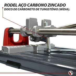 Cortador De Pisos Cerâmicos Azulejos Porcelanatos 90Cm Hd900 Descrição: Os cortadores profissionais da linha hd são indicados para cortar pisos cerâmicos e porcelanatos com até 10 mm de espessura. Sistema de separação na parte superior do carro guia; Guias em aço carbono cromado; Limitador para corte lateral garantindo medidas uniformes em cortes retos ou em diagonal; Carro-guia e barra de encosto em alumínio injetado; Rodel cortante com haste em aço carbono zincado e disco de carboneto de tungstênio wídia . Especificações: Sistema de separação fabricado em aço e tratado termicamente para maior vida útil; Barra de encosto em alumínio injetado proporcionando alta resistência e durabilidade; Limitador lateral para cortes retos e diagonais precisos; Base e suporte das guias em chapa de aço carbono com pintura eletrostática a pó; Alça para transporte; Pé antiderrapante. Comprimento máximo de corte: 900 mm Tamanho máximo de piso para corte diagonal: 640mm x 640mm Espessura máxima de corte: 10 mm Rodéis para : 80mm / 80 mm duplo Comprimento: 1035 mm Largura:182 mm Altura: 94,5mm Peso: 6,800 kg Ean: 7897451461107