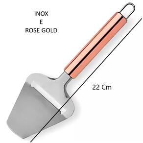 Produto de ótima qualidade produzida em aço inox e cabo com acabamento em rosê gold, que possui o design moderno deixando sua cozinha ainda mais bela.