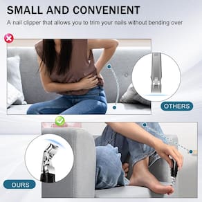 - [Design ergonômico] Esses cortadores de unhas para idosos têm um ângulo exclusivo para facilitar o uso, especialmente para as unhas dos pés, e incluem um coletor de unhas embutido para evitar que os recortes se espalhem. Esse design é ideal para reduzir a necessidade de se curvar desconfortavelmente, tornando-o a melhor escolha para mulheres, idosos e pessoas com dores nas costas
