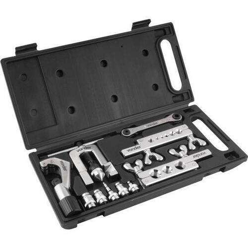 Conteúdo da Embalagem:1 jogo de cortador e flangeador de tubos com 11 peças, sendo: 1 maleta plástica, 1 flangeador, 1 cortador, 5 acessórios para alargar tubos, 2 bases de fixação dos tubos e 1 chave catracaDescrição:Cortador e flangeador de tubos, jogo com 11 peças, VONDERAplicações e dicas de uso:Indicado para cortar, flangear e alargar/expandir tubos de cobre e alumínioDestaques e diferenciais:Possui escareador para a remoção de possíveis rebarbas ou irregularidades, além de alargadores/expansores que auxiliam no dimensionamento do tubo, proporcionando maior precisão na soldagem da tubulação quando necessárioCaracterísticas Técnicas:Capacidade do cortador para tubos de cobre: 1/8 a 1.1/8 - (3 mm a 28 mm) Capacidade do flangeador (base de fixação) para tubos de cobre: 1/8, 3/16, 1/4, 5/16, 3/8, 7/16, 1/2, 5/8 e 3/4 Material do corpo do cortador de tubos de cobre: Alumínio Material do flangeador para tubos: Ferro fundido nodularGarantia legal: 90 dias