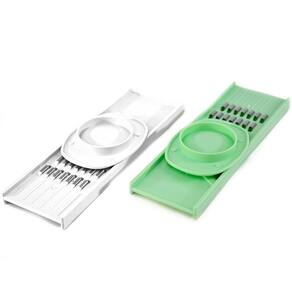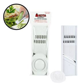 Cortador e Ralador de Plástico 21cm Legumes - O Cortador e fatiador Keita é ideal para legumes, verduras e queijos, design simples que cabe em qualquer espaço;\n- Fabricado em plástico, é versátil, possui duas faces com lâminas em aço inox: uma para cortar em rodelas e outra para desfiar;\n- Acompanha um protetor de mãos que auxilia ao segurar o alimento;\nEspecificações:\nMarca : KEITA\nTipo de material : Plástico\nCores ou Estampa : Branco\nDimensões do Produto : 21 X 6,5 X 1,5 CM\nDimensões da Embalagem : 27 X 6,5 X 2,5 CM\nPeso Bruto (Gramas) : 0.064 Marca: Não Informado