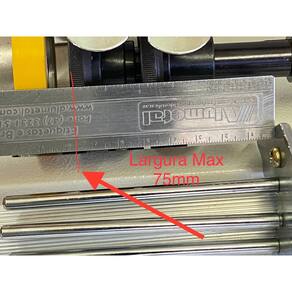 Sistema 2 facas reguláveis 2 facas superior + 2 facas inferior Diametro da faca 62mm Largura máxima do corte: 75mm Comprimento do braço: 550mm Mesa de madeira e estante de aço Motor: Servo motor HMC Potencia: 550w Voltagem:220v Velocidade 5000RPM Frequência: 60hz Recomenda-se o uso de estabilizador 700VA