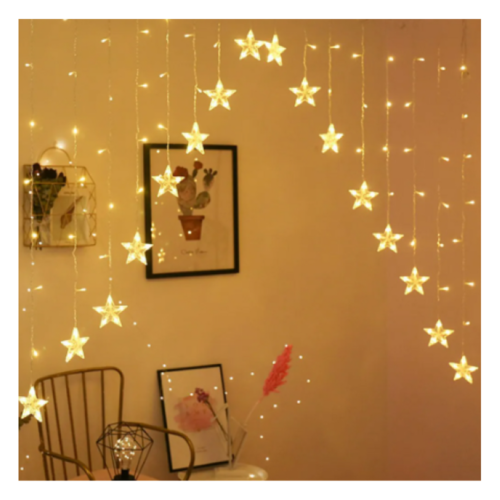 Cortina com estrela da ponta usada para você decorar seu Natal. Modelo super inovador. Tem estrelas na ponta de cada cordão que forma a cortina. Apresenta várias funções de pisca onde você regula a que mais lhe agradar. Modelo bivolt Warm cor branco quente (amarelada).