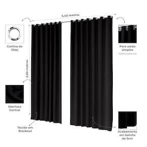 Características: Cortina longa para pé direito duplo Ideal para varão simples de 4m Tecido blackout (avesso todo preto) Não acompanha varão Detalhe de acabamento em ilhós Medida total de 5,40m de largura ESTICADA Cortina dividida 2 partes, ou seja, pode ser aberta ao meio Produto não é plástico (PVC), é tecido Cortina não é 100% Blackout, veda aproximadamente 70% Cada parte da cortina possui 2,70m ESTICADA Tecido Blackout Composição 100% Poliéster Marca: Paulo César