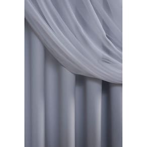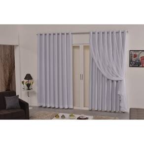 A cortina blackout com voal é composta por duas partes de 1,50 de largura por 2,80 de altura , totalizando 3,00x2,80 com ilhós na cor prata , para varão de 18mm ao 28mm , corta luz em torno de 80 a 90%.