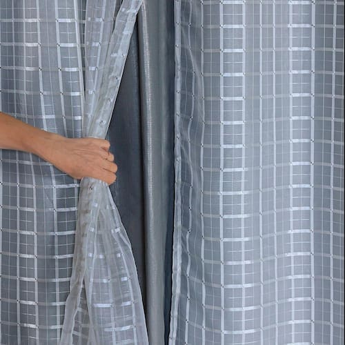 A cortina possuí duas partes, o blackout de PVC e por cima o Tecido Voil. O PVC é um tipo de plástico especialmente feito para cortinas, possuí uma textura na frente para imitar um tecido e é colorido. A parte de trás do PVC é da cor cinza, a parte cinza que faz vedar 99 % a luz