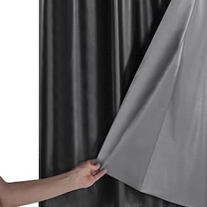 A cortina possuí duas partes, o blackout de PVC e por cima o Tecido Voil. O PVC é um tipo de plástico especialmente feito para cortinas, possuí uma textura na frente para imitar um tecido e é colorido. A parte de trás do PVC é da cor cinza, a parte cinza que faz vedar 100 % a luz