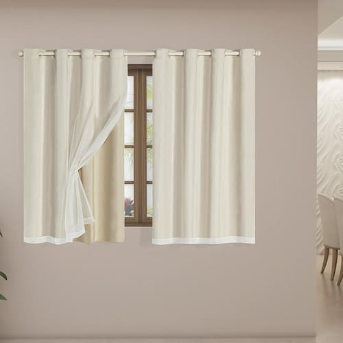 Contém: 01 Cortina 2,80 mts x 1,80 mts no total, sendo: 02 Partes de 1,40 mts x 1,80 mts com 16 ilhoses no total de 28 mm Indicada para varão simples de até 2,00 mts, é possível utilizar tanto o varão grosso 28 mm , quanto o fino 19 mm varão não incluso