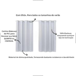 Marca: Plast LeoCor: CinzaMaterial: 100% PVCContém: 1 Peça Folha Dimensões: Altura: 138 cm x Largura: 138 cm. COM ILHÓS - Escurece o ambiente.- Para janelas de até 1,20m de altura- Bloqueia a entrada de raios solares.- Ajuda a controlar a temperatura.Vantagens:- Bloqueio da luz:A principal vantagem de uma cortina black-out é sua capacidade de bloquear a luz do sol. Isso é especialmente útil em quartos, salas de estar ou qualquer ambiente onde você deseje controlar a quantidade de luz que entra.- Privacidade:Além de bloquear a luz, a cortina black-out também oferece privacidade. Ela impede que pessoas do lado de fora vejam o interior do ambiente, proporcionando um nível maior de intimidade e segurança em sua casa.- Redução de ruídos:Além de bloquear a luz, a cortina black-out também pode ajudar a reduzir os ruídos externos. Em resumo, a cortina black-out oferece benefícios significativos em termos de controle da luz, privacidade, isolamento térmico e redução de ruídos, além de contribuir para a estética e decoração do ambiente.As cores das imagens exibidas podem sofrer variações dependendo da tela em que são visualizadas.