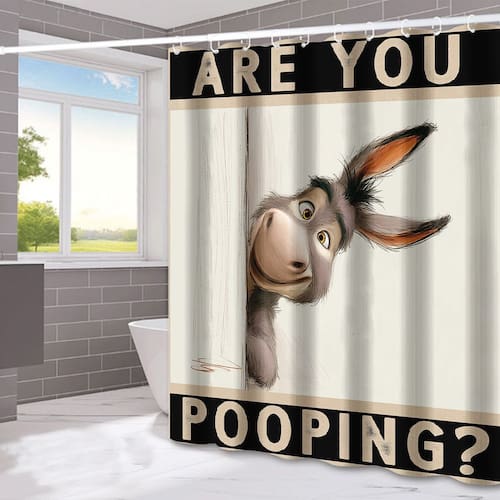Tamanho da cortina de chuveiro: 180* 180 cm Peso: 380 g Material: poliéster Cor: burro Embalagem: 1 x cortina de chuveiro (cor igual à imagem principal) • Arte humorística de burro — Apresenta um divertido burro de desenho animado espreitando por trás de uma porta com tipografia ousada, trazendo uma atmosfera divertida e alegre à decoração do seu banheiro. • Poliéster impermeável durável — Feito de tecido de poliéster de alta qualidade que bloqueia efetivamente a água respinga enquanto mantém um tecido suave e uma qualidade de impressão vívida. • Resistente a mofo e de secagem rápida — Projetado para secar rapidamente após cada banho para ajudar a reduzir umidade e evita o acúmulo de mofo, mantendo seu banheiro mais fresco e limpo. • Cobertura padrão de 180 × 180 cm — Serve para a maioria das banheiras e cabines de chuveiro, oferecendo total privacidade e contenção confiável de água em banheiros pequenos e grandes. • Fácil instalação com ganchos — Inclui 12 ganchos para configuração rápida na maioria das hastes de cortina, simplificando a instalação, remoção ou substituição conforme necessário.