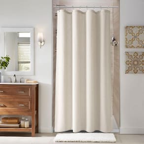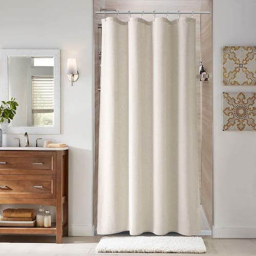 - Bainha pesada e repelente à água: a bainha desta cortina de chuveiro de linho é pesada para mantê-la no lugar e evitar que ela voe durante o uso. A superfície da cortina de chuveiro é tratada com um revestimento de água que estimula a formação de gotas de água rapidamente, ajudando a manter seu banheiro limpo e seco. Para um revestimento de água ideal, recomendamos usar um forro com esta cortina de chuveiro.