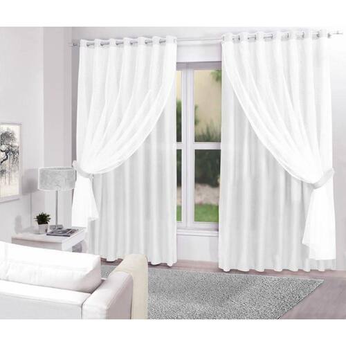 Características do Produto Dimensões: 3,00m de largura 2,70m altura. Material: Tecido e renda 100% poliéster. Ideal para varão simples no máximo até 2,00m. Varão não incluso. Contém:. 01 Cortina. Observações: Considerar medidas e formatos especificados na descrição do produto Composto apenas pela cortina, demais itens e acessórios. são decorativos e não acompanham o produto Ean: 7908235915553