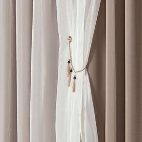 Cortina Mabelle, confeccionada no tecido voil e forro semi blackout que bloqueia até 50% da claridade, acompanha duas abraçadeiras (pingentes) em pedraria com imã.