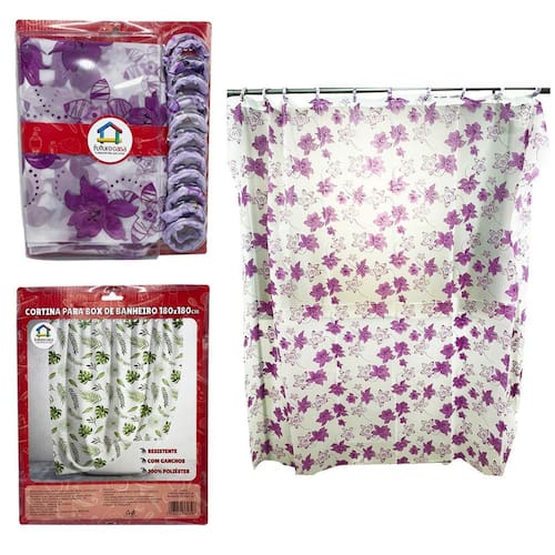 Contém na embalagem 01 cortina para box banheiro com ganchos 100% poliester 180cm