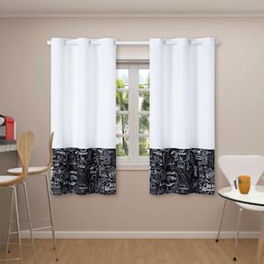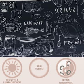As Cortinas Cook tem o intuito de proporcionar maior proteção e privacidade e deixar a cozinha mais aconchegante e confortável, valorizando a decoração e dando à mesma um toque todo pessoal., Possui efeito é leve e bonito, além de complementar a decoração com suas belas estampas.Cortina de Cozinha para Varão SimplesCortina dividida em 2 partes (pode ser aberta ao meio)Produto estampado, com detalhe liso na parte superiorPrático para instalar: Basta passar o varão por dentro de cada ilhósPor ser um tecido leve, é prático de lavar e seca rápidoIdeal para varão, desliza muito facilmente para os lados, permitindo praticidade para abrir e fecharCortina utiliza 2,20m de tecido em sua largura total para melhor franzimentoVarão não acompanha o produto. Vendido separadamenteEmbalagem: Cortina 2,20m (Largura) x 1,45m (Altura) (2 peças de 1,10m x 1,45m)Composição: 100% PoliésterIndicado para varão de 1,5 mCortina com 12 Ilhoses (28mm)