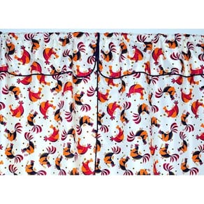 Cortina estampada em tecido oxford com fundo palha e com estampa de várias galinhas cozinheira nas cores vermelho, laranja e marrom.