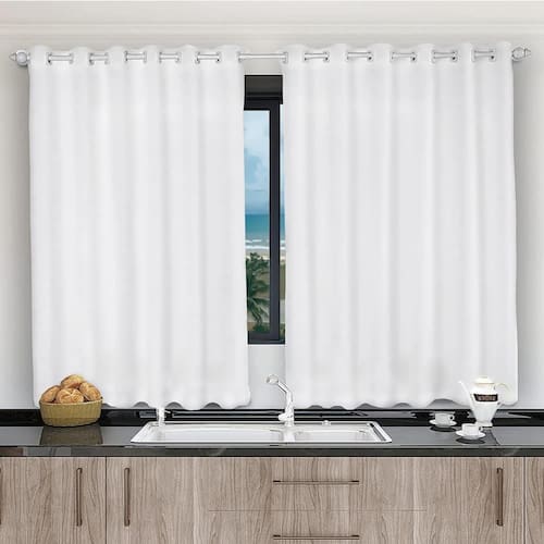 Linda Cortina para Cozinha Medidas Prontas: Largura 2,00m x Altura 1,20m Dividida em 2 partes de 1,00m x 1,20m Tecido: Cetim Vison / 100% Poliéster Cor: Branco Acabamento feito na Bainha Ilhós Branco, indicado para Varão de 28mm Cortina ideal para Varão de até 1m Não acompanha o Varão Tecido de ótima Qualidade e Durabilidade Marca: Lm Detona
