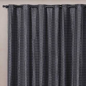01- cortina em tecido voal xadrez com forro de microfibra 2,00 larg x 1,70 alt Ilhós quadrados e cromados prateados brilhantes Cortina aberta ao meio contendo 2 partes de 1,30 larg x 1,70 alt cada