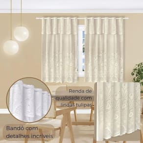 - contém: 01 cortina para cozinha em renda para varão com bandô - tamanho: cortina - 2,00 m largura x 1,30 m altura x 0,30m bandô - tamanho recomendado do varão - 1,50 pra franzir - composição: 100% poliéster