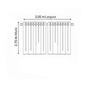 Contém: 01 cortina 2,70m altura x 3,00m largura no total, sendo: 02 partes de 2,70m altura x 1,50m largura com 16 ilhós cromados no total, sendo 8 de cada lado Indicada para varão simples de 2,00m de até 28mm Detalhe: consumo de tecido 3,00m largura por 2,70m altura