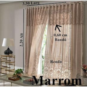 Cortina sala quarto 3,50x2,20 com bando renda marrom A linha de renda clássica da interlar é digna do luxo e beleza, foi elaborada especialmente para conferir sofisticação ao ambiente. O tecido rendado é leve e delicado, desenvolvido com uma técnica exclusiva de entrelaçamento dos fios, dando um toque charmoso e romântico a casa. Composto por: 1 cortina renda clássica com bandô 3,50x2,20 mts Tamanho: Largura: 3,50 mts Altura: 2,20 mts Bando: 0,60 cm Indicações: - varão com até 2,50 mts de comprimento; - tipo do suporte: simples (para 1 varão); - suportes e varão não acompanham o produto. Composição do tecido: 100% poliéster Qual a medida ideal de cortina para a sua janela: A medida certa para sua cortina precisa ser no mínimo 30cm maior que a janela na largura e 45cm maior na altura. O varão deve ser fixado a 15cm da parte superior da janela, o suporte do varão ficará preso à parede na distância de 15cm das laterais da janela e as ponteiras a 5cm de cada suporte. Vantagens do produto: - cortina com passante; - barra decorativa; - fácil de lavar; - decora o ambiente; - resistência e durabilidade; - ótimo caimento e acabamento.