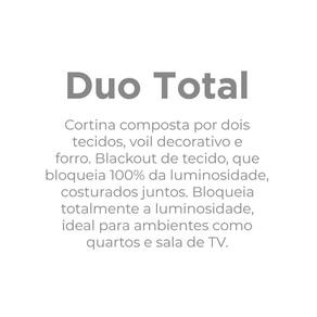 Requintada e cheia de charme, a cortina duo é composta por um voil decorativo no tecido bellini e um blackout de tecido que bloqueia 100% a luminosidade, apresentando sofisticação e beleza em seu lar, podendo utilizar em seu quarto, sala ou escritório. A cortina Duo total tem o benefício de diminuir a temperatura dentro da sua residência, controle de acústico e privacidade para a sua família. O forro frente e verso 100% poliéster e tecido interno 100% Poliamida e o Voil 100% poliéster propondo um estilo contemporâneo e com o toque liso, possui 2 partes de 2,10m de largura por 2,30m de altura com acabamento na bainha lateral e barra na parte inferior. Indicado para varão de 2,00M com 28 ilhoses. Fotos ilustrativas, não acompanha o varão.