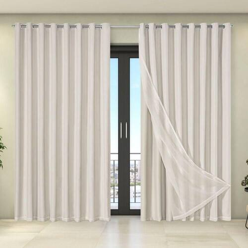 Cortina Tecido Blecaute Com Voil Liso 2,70 M X 2,30 M 100% Poliéster - Bege Cortina Tecido Blecaute com Voil Liso 2,70 m largura (esticado) x 2,30 m altura As Cortinas da Linha Blecaute da EDDI Casa impedem a passagem de luz e raios ultra violeta preservando assim o piso e os móveis do envelhecimento. Ideal também para escurecer seu quarto ou sala e manter a temperatura. Reduz em até 80 % a luminosidade.